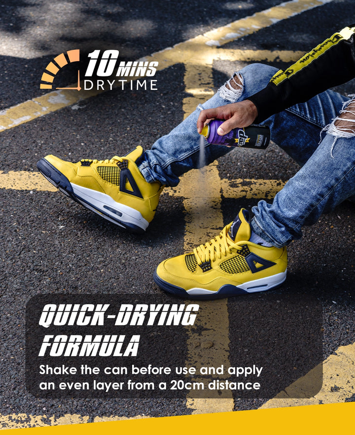 Once you have shaken the spray, hold the Crep Protect Spray from a 20cm distance, press down on the nozzle, and coat the sneaker in a continuous motion. Start from the laces and work your way towards the toe box and heel section. After you have applied one coat, let your trainers dry for 10 minutes in direct sunlight or a room temperature setting. Repeat this process and allow your trainers to dry for another 10 minutes before wearing.